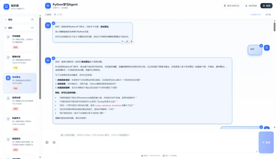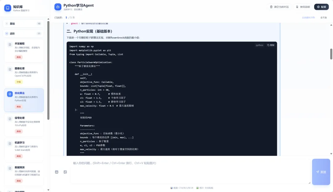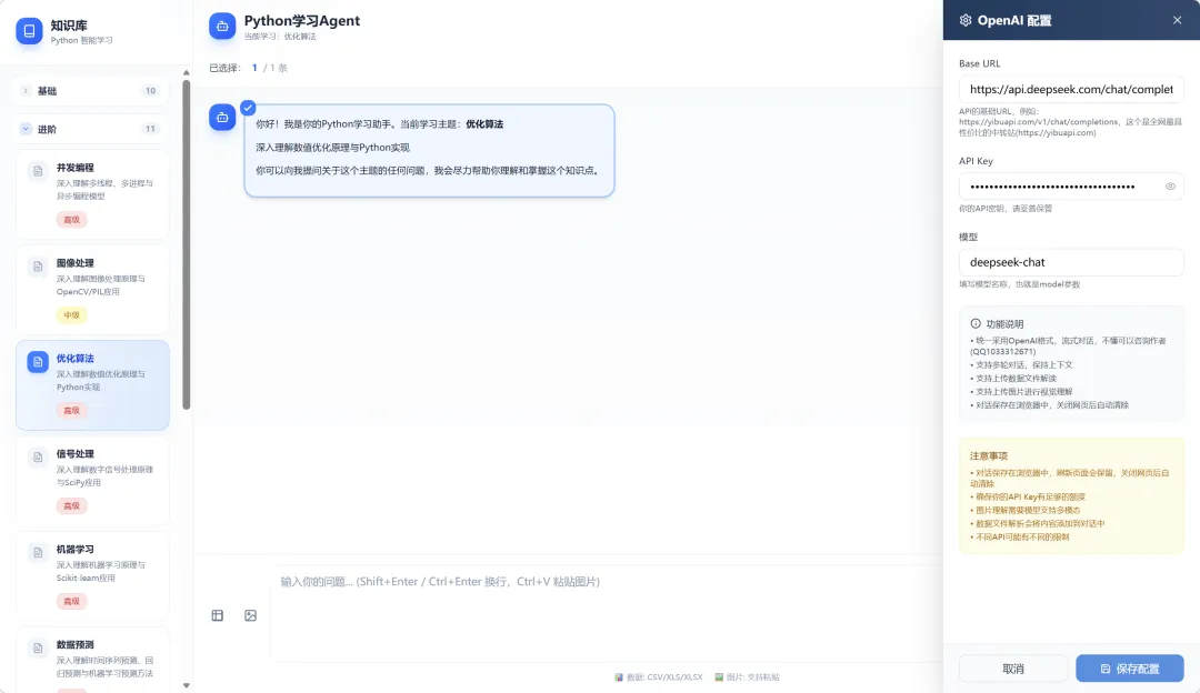 本期介绍自研的2款在线编程学习工具,无需部署,直接进入网址就能使用,右边配置,按教程填写参数,将一个大模型api暴改为Agent,内置Python和Matlab知识库(几乎涵盖所有数据分析、数学建模、统计建模涉及到的知识),帮助编程小白快速入门,支持文档、数据文件、图片上传,右边可以自行配置接口(配置好了点保存)Python:https://hcb63d4zp9.coze.site/
