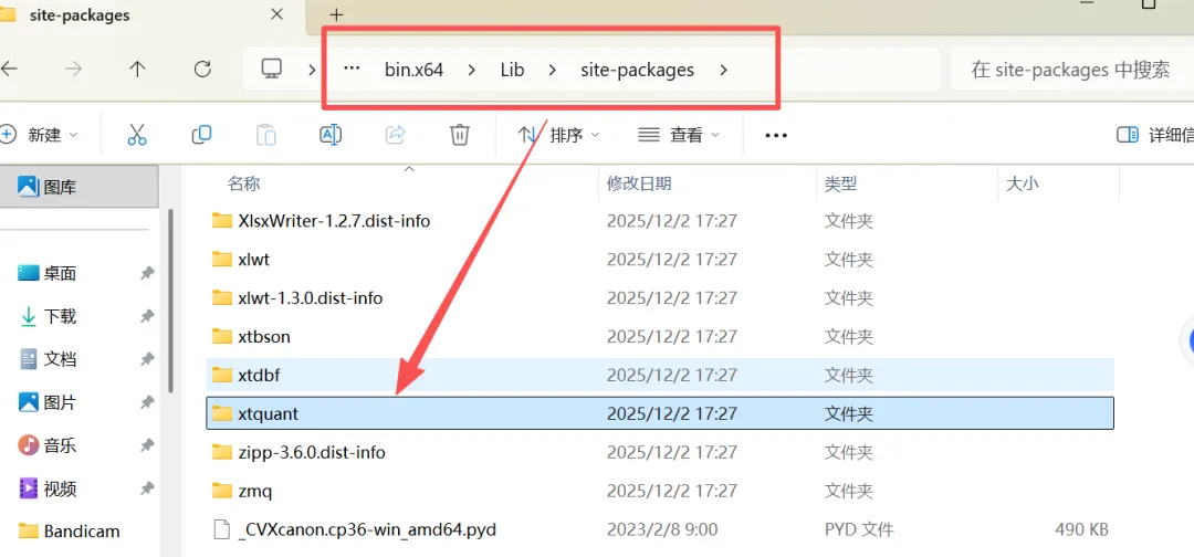 详细路径在 QMT 安装目录bin.x64 / Lib / site-packages下。