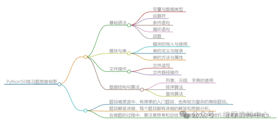 初学Python的时候,千万别背书记语法,要学以致用才能查漏补缺,自己上手敲一道代码题就都会了!这里给大家分享一份大佬整理的150道Python练习题,这里面包含了python基础内容和一些较难的算法内容,大家可以根据自己的学习情况进行学习,而且每道题的后面都有详细的答案和解析,大家可以来尝试一下。
