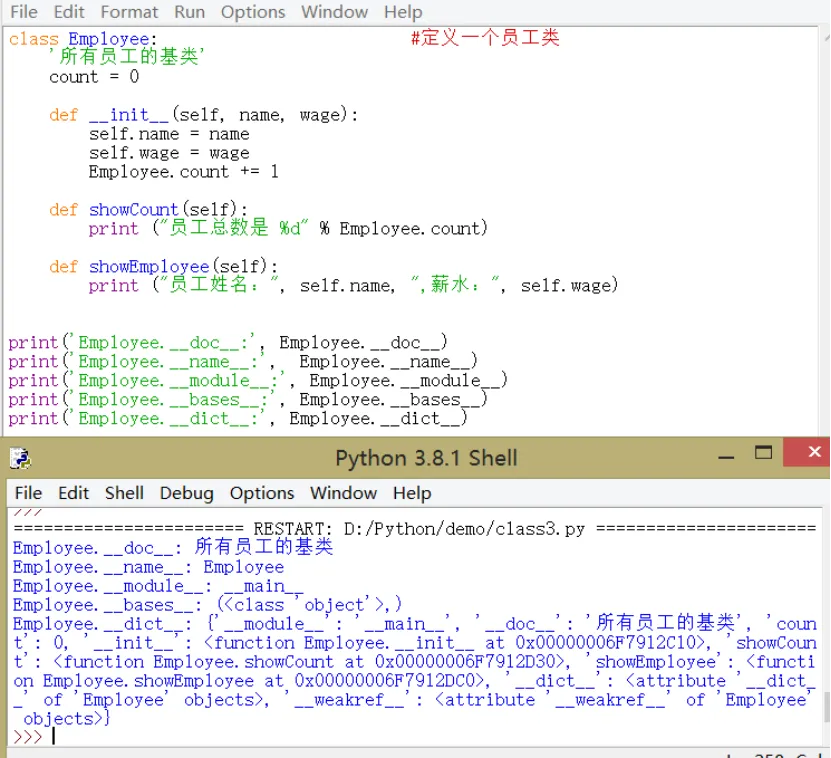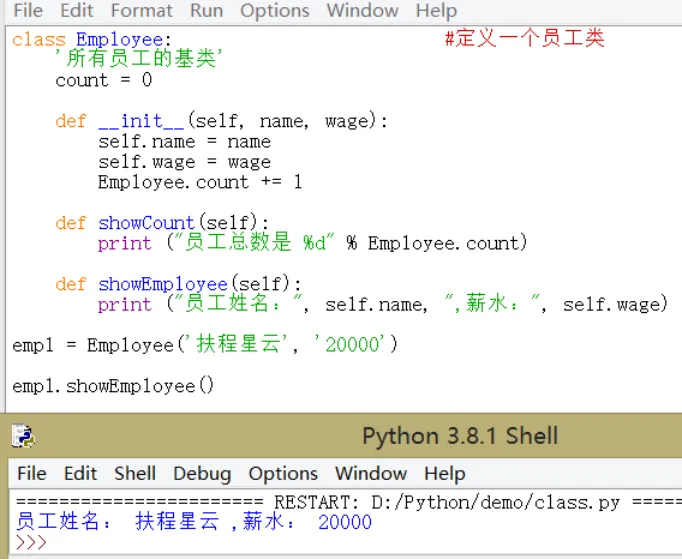 使用class语句来创建一个新类,class之后为类的名称并以冒号结尾,类的帮助信息可以通过ClassName.__doc__查看。class_suite由类成员、方法、数据属性组成。class Employee: #定义一个员工类 '所有员工的基类' count = 0 def __init__(self, name, wage): self.name = name self.wage = wage Employee.count += 1 def showCount(self): print ("员工总数是 %d" % Employee.count) def showEmployee(self): print ("员工姓名:", self.name, ",薪水:", self.wage)emp1 = Employee('扶程星云', '20000')emp1.showEmployee()
