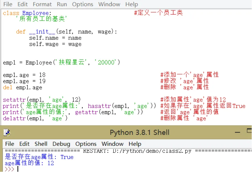 我们可以使用点(.)来访问对象的属性。使用如下类的名称访问类变量:emp1.age = 18 #添加一个'age'属性emp1.age = 19 #修改 'age'属性del emp1.age #删除 'age'属性