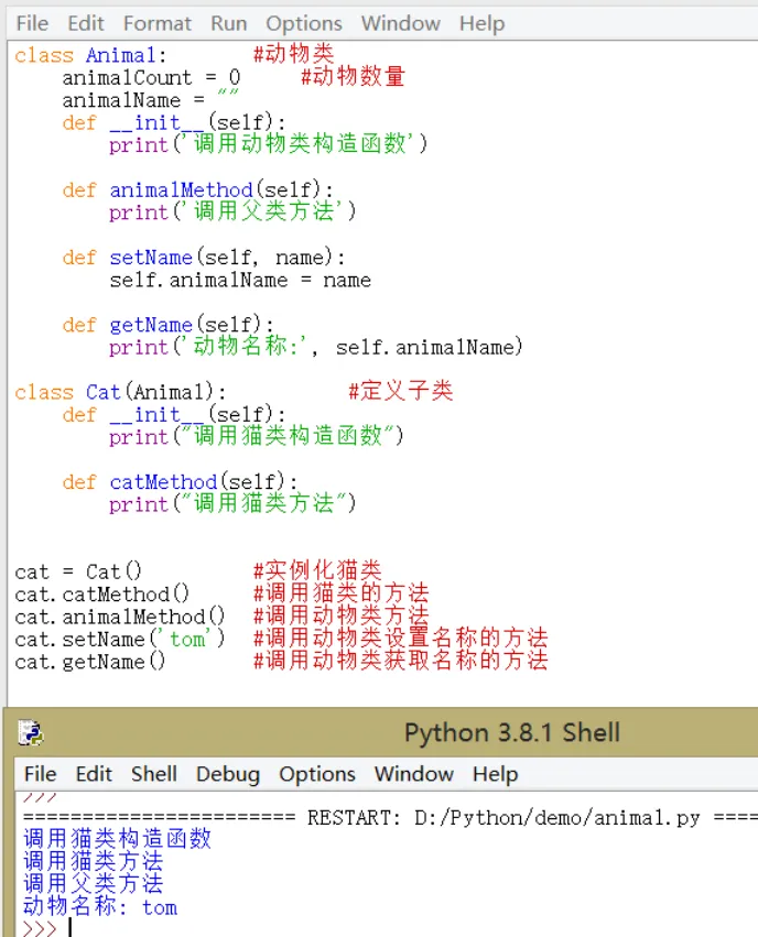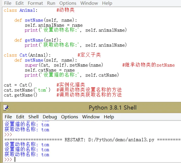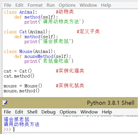 面向对象的编程带来的主要好处之一是代码的重用,实现这种重用的方法之一是通过继承机制。继承完全可以理解成类之间的类型和子类型关系。比如猫类、狗类都是动物类子类型,猫类、狗类继承了动物类的相关特性。需要注意的地方:继承语法class 派生类名(基类名): 在继承中基类的构造方法(__init__)不会被自动调用,它需要在其派生类的构造中亲自专门调用。 在调用基类方法时,需要加上基类的类名前缀,且需要带上self参数变量。区别于在类中调用普通函数时并不需要带上self参数 Python总是首先查找对应类型的方法,如果它不能在派生类中找到对应的方法,它才开始到基类中逐个查找。(先在本类中查找调用的方法,找不到才去基类中找)。 如果在继承元组中列了一个以上的类,那么它就被成为“多重继承”。我们可以使用issubclass()或者isinstance()方法来检测。issubclass():布尔函数判断一个类是另一个类的之类或者子孙类。isinstance(obj,Class):布尔函数如果obj是Class类的示例对象或者是一个Class之类的实例对象则返回true。isinstance()函数类似type()函数,他们的区别是type()不考虑继承关系,而isinstance()函数会认为子类是一种父类类型,考虑继承关系。9、方法重写