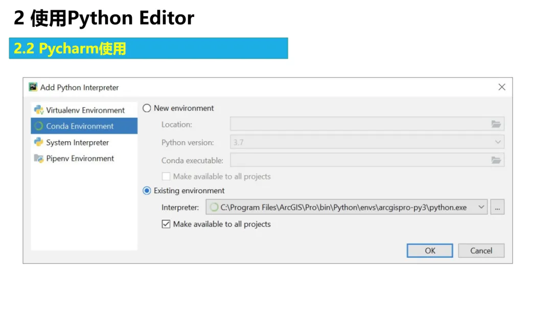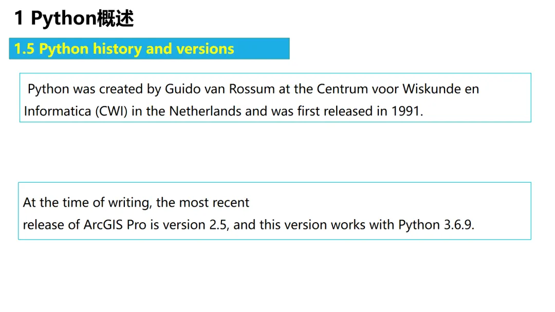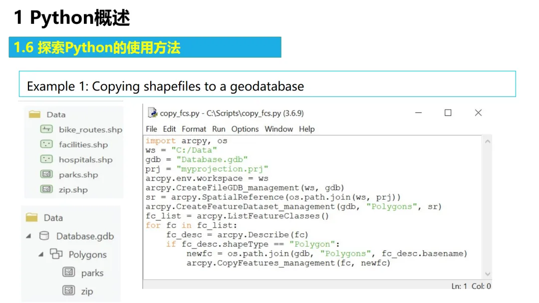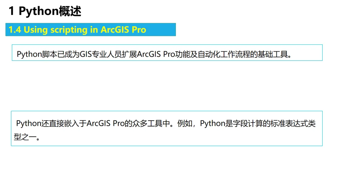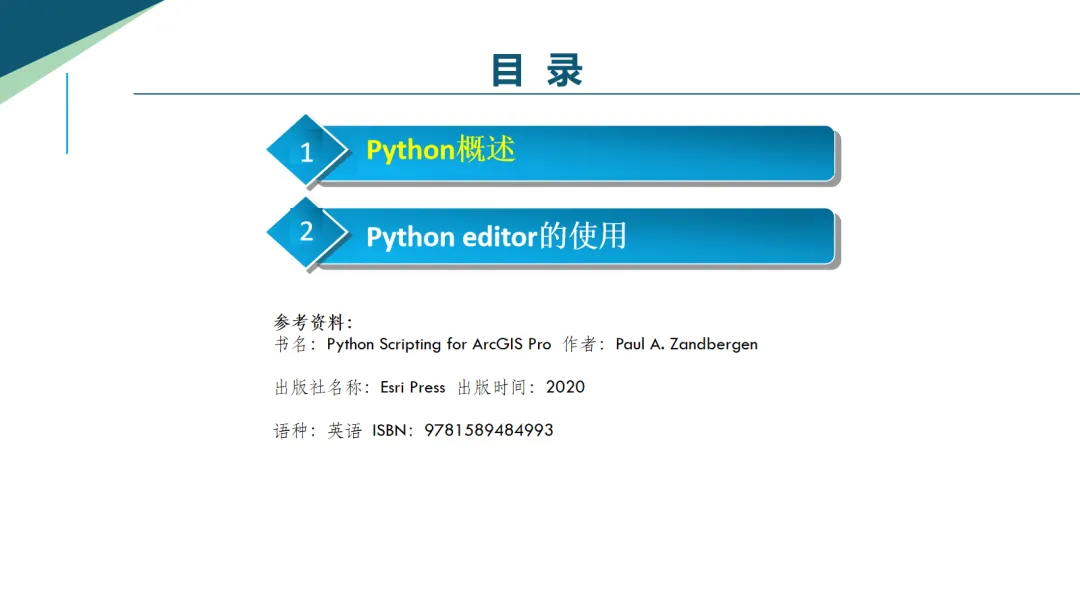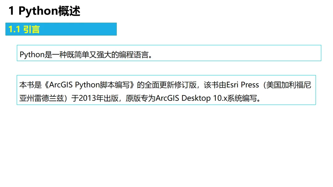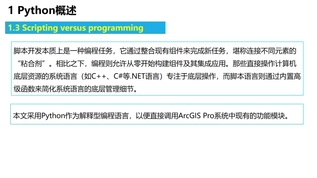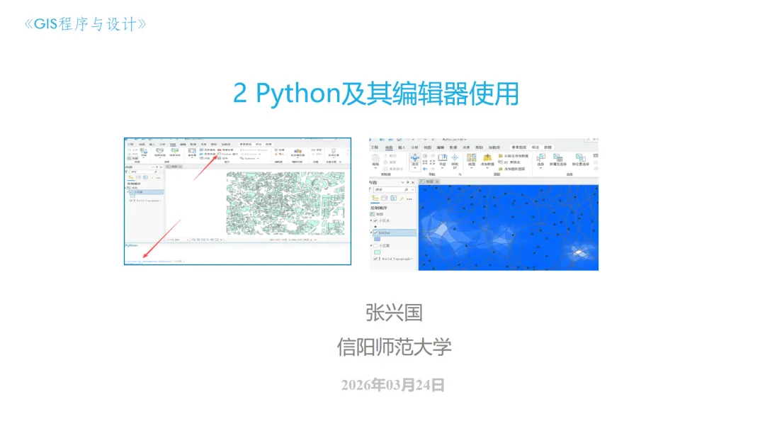《GIS程序与设计》课程讲稿-第2章 Python及其编辑器使用,信师大张兴国老师提供。第二章 Python及其编辑器使用,主要介绍Python基础知识、Python编辑器的使用。tip:若在conda中没有arcgispro-py3环境,可以添加,命令如下:conda config --add envs_dirs "D:\Program Files\ArcGIS\Pro\bin\Python\envs"conda activate arcgispro-py3