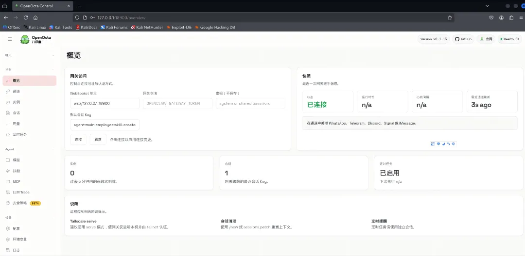 图3:OpenOcta网关启动成功提示通过本地IP:18900访问控制台:127.0.0.1:18900/overview图4:OpenOcta Web控制台首页三、配置大语言模型(以 Kimi 为例)
