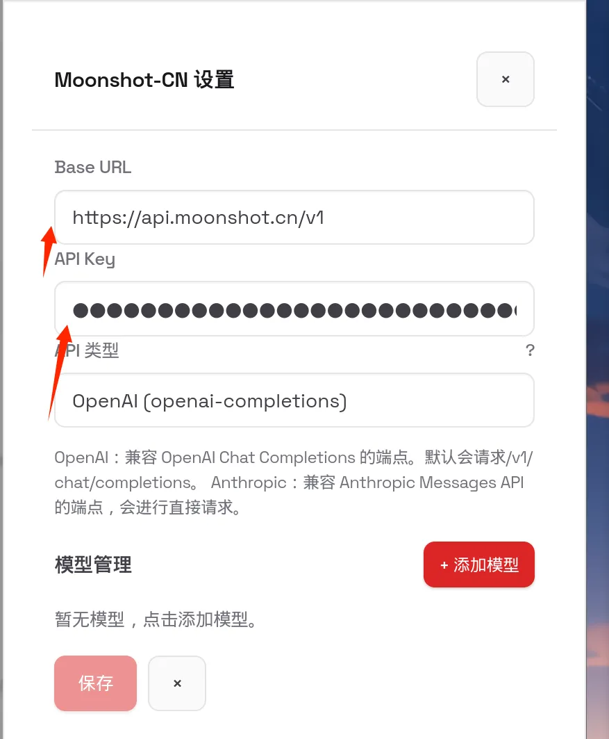 OpenOcta本身并没有智能,它需要利用外界的大语言模型才能做出决策,调用工具。目前支持几乎所有大语言模型。这里我们以kimi为例,控制台进入「模型」,选择“Moonshot-CN”:Base URL:https://api.moonshot.cn/v1图5:OpenOcta中配置Kimi大模型参数- 会消耗token,如需免费可本地搭建ollama等大模型