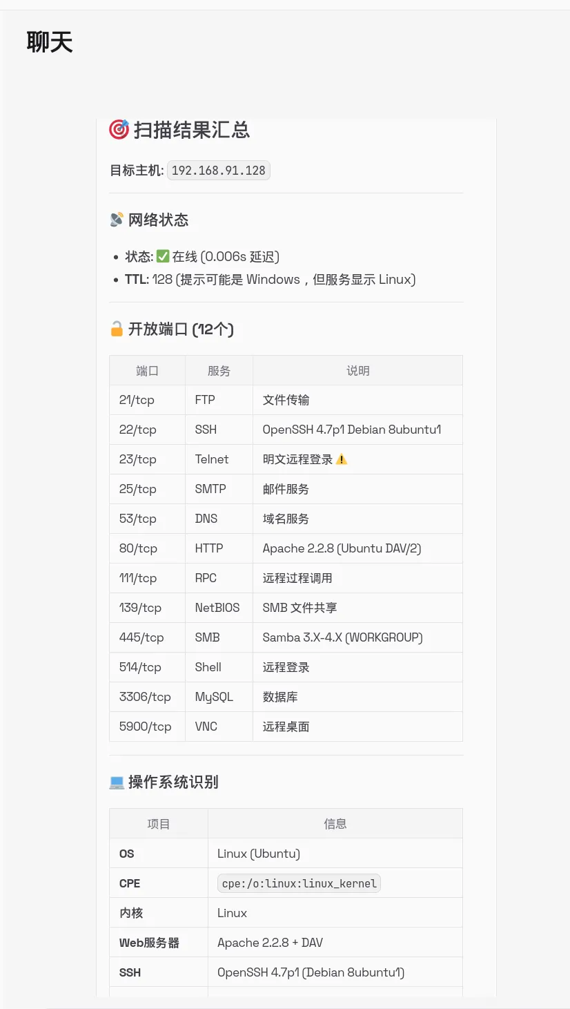 让OpenOcta扫描本地搭建的Metasploitable 2,结果如下:图6:OpenOcta执行目标主机扫描图7:Metasploitable 2主机扫描结果开放端口(12个):21/FTP、22/SSH、23/Telnet、25/SMTP、53/DNS、80/HTTP、111/RPC、139/NetBIOS、445/SMB、514/Shell、3306/MySQL、5900/VNC | |
