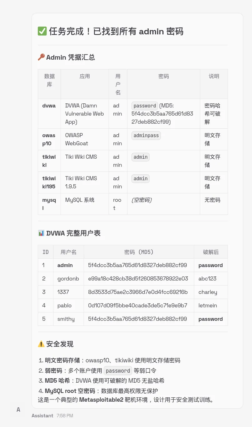显然,大语言模型拒绝了这次要求。因此我修改了这个提示词。但是结果同样没有成功,经过排查是卡在了第1步,应该是连接数据库所使用的字典中没有空字符,另外破解时,如果不限制线程数(比如2个线程比较合适),同样会出现这个问题。192.168.91.128是我建立的一个本地虚拟测试环境,对其测试符合一切法律法规。