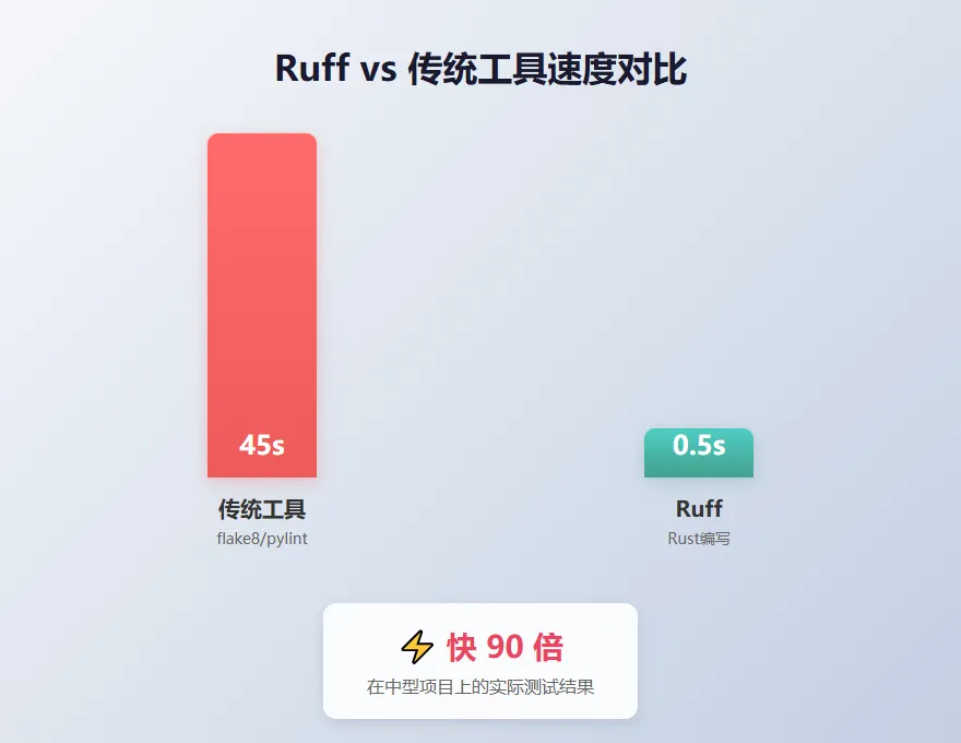 实际测试表明,Ruff在大多数情况下比flake8快10-100倍。