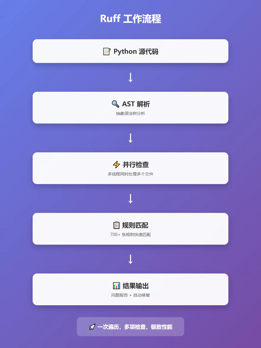 2. 高效的算法设计 Ruff采用了优化的AST(抽象语法树)遍历算法,能够在一次遍历中完成多项检查,而不是像传统工具那样多次遍历代码。