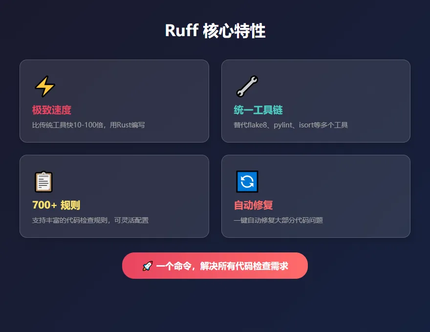 Ruff是一个革命性的Python代码分析工具,它通过以下方式重新定义了代码分析的速度与效率: