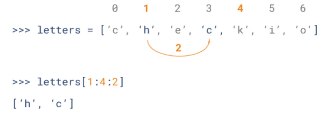 变量[头下标:尾下标:步长]索引值以0为开始值,-1为从末尾的开始位置。步长指间隔几个元素取值组成新的列表,头下标和尾下标指元素的取值范围,不指定范围默认是全部范围lt[:],不指定步长默认为1 lt[::1]。如果步长为-1就是倒序取列表的值lt[::-1]