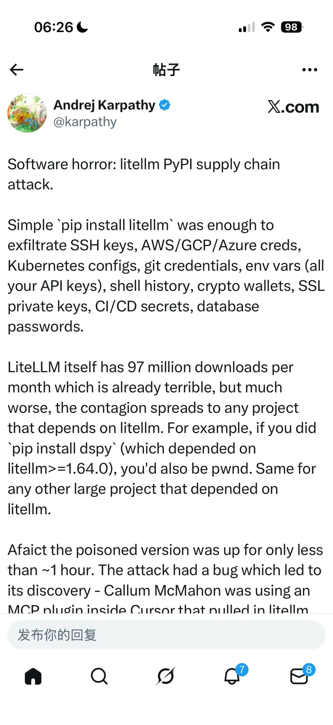 软件恐怖事件:litellm PyPI 供应链攻击。