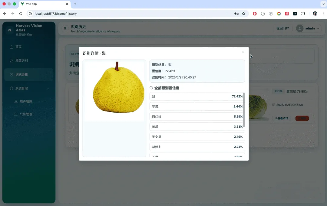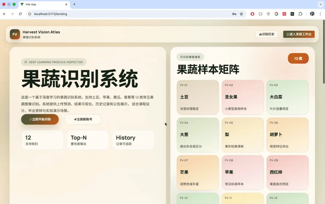 随着人工智能与计算机视觉技术的不断发展,基于深度学习的图像识别已经广泛应用于农业分拣、智慧零售、食品检测和科普教育等场景。传统的果蔬分类主要依赖人工经验,不仅效率较低,而且在品类较多、工作强度较大的情况下容易出现误判。将深度学习技术引入果蔬识别领域,能够有效提升识别效率和标准化水平,为农产品数字化管理提供技术支持。本课题以常见果蔬为研究对象,设计并实现一个集用户管理、图片上传、智能识别、历史查询和公告发布于一体的果蔬识别系统,具有较强的实践意义。