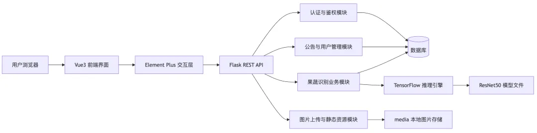 本系统面向果蔬图像智能识别场景进行设计与实现,围绕“上传图片、自动识别、结果展示、历史留存、信息管理”构建了一套完整的 Web 应用。系统可识别的类别包括土豆、圣女果、大白菜、大葱、梨、胡萝卜、芒果、苹果、西红柿、韭菜、香蕉、黄瓜共 12 类常见果蔬。前端采用 Vue3 与 Element Plus 搭建交互界面,后端基于 Flask 框架实现接口服务,并结合 TensorFlow 与 ResNet50 模型完成核心识别任务。用户登录后可上传果蔬图片,系统将自动完成图片预处理、模型推理、结果排序与历史记录存储。