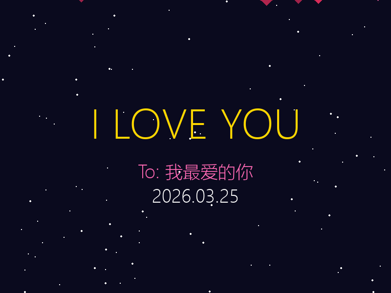 import pygameimport sysimport randomfrom PIL import Image# 初始化pygame.init()screen = pygame.display.set_mode((800, 600))pygame.display.set_caption("💖 专属表白特效")# 颜色定义BLACK = (10, 10, 30)PINK = (255, 105, 180)RED = (255, 50, 100)WHITE = (255, 255, 255)GOLD = (255, 215, 0)# 使用支持中文的字体font_big = pygame.font.SysFont('microsoftyahei', 80)font_small = pygame.font.SysFont('microsoftyahei', 36)# 心形飘落粒子class Heart: def __init__(self): self.x = random.randint(0, 800) self.y = random.randint(-100, 0) self.size = random.randint(8, 20) self.speed = random.uniform(1, 3) self.color = random.choice([PINK, RED, (255, 182, 193)]) self.alpha = random.randint(150, 255) def update(self): self.y += self.speed if self.y > 600: self.y = random.randint(-100, 0) self.x = random.randint(0, 800) def draw(self, surface): heart_surface = pygame.Surface((self.size * 2, self.size * 2), pygame.SRCALPHA) pygame.draw.circle(heart_surface, (*self.color, self.alpha), (self.size // 2, self.size // 2), self.size // 2) pygame.draw.circle(heart_surface, (*self.color, self.alpha), (self.size * 3 // 2, self.size // 2), self.size // 2) pygame.draw.polygon(heart_surface, (*self.color, self.alpha), [ (self.size, self.size * 1.5), (0, self.size // 2), (self.size * 2, self.size // 2) ]) surface.blit(heart_surface, (self.x - self.size, self.y - self.size))# 创建心形粒子hearts = [Heart() for _ in range(50)]# 主循环clock = pygame.time.Clock()running = True# GIF保存相关save_gif = True # 设置为True保存GIFframes = [] # 存储帧max_frames = 150 # 保存的帧数(约2.5秒,60fps)frame_count = 0print("💖 开始录制动画...")while running: for event in pygame.event.get(): if event.type == pygame.QUIT: running = False if event.type == pygame.KEYDOWN: if event.key == pygame.K_ESCAPE: running = False if event.key == pygame.K_s: # 按S键保存GIF save_gif = True frames = [] frame_count = 0 print("📸 重新开始录制...") screen.fill(BLACK) # 绘制星星(固定种子让星星位置一致,GIF更流畅) random.seed(42) for _ in range(100): x = random.randint(0, 800) y = random.randint(0, 600) size = random.randint(1, 2) pygame.draw.circle(screen, WHITE, (x, y), size) random.seed() # 恢复随机种子 # 更新和绘制心形 for heart in hearts: heart.update() heart.draw(screen) # 绘制文字 text = font_big.render("I LOVE YOU", True, GOLD) text_rect = text.get_rect(center=(400, 250)) screen.blit(text, text_rect) name_text = font_small.render("To: 我最爱的你", True, PINK) name_rect = name_text.get_rect(center=(400, 350)) screen.blit(name_text, name_rect) date_text = font_small.render("2026.03.25", True, WHITE) date_rect = date_text.get_rect(center=(400, 400)) screen.blit(date_text, date_rect) # 保存帧用于GIF if save_gif and frame_count < max_frames: # 将pygame表面转换为PIL图像 frame_data = pygame.image.tostring(screen, 'RGB') frame = Image.frombytes('RGB', (800, 600), frame_data) frames.append(frame) frame_count += 1 print(f"📷 已捕获帧: {frame_count}/{max_frames}", end='\r') pygame.display.flip() clock.tick(60)# 保存GIFif frames: print("\n💾 正在保存GIF...") # 优化:减少颜色数量使GIF更小 frames[0].save( 'love_animation.gif', save_all=True, append_images=frames[1:], duration=50, # 每帧50毫秒(20fps) loop=0, # 无限循环 optimize=True ) print("✅ GIF保存成功!文件:love_animation.gif")pygame.quit()sys.exit()
