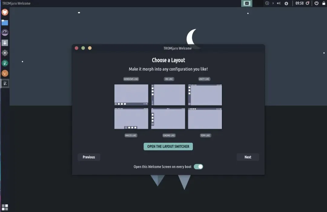 然而,Tromjaro 的一个突出之处是它包含一个桌面布局切换器(图 1)。Tromjaro 的默认桌面是 Xfce,它提供了六种不同的布局:Windows风格、MX风格、Unity风格、macOS风格、GNOME风格和TOPX风格。