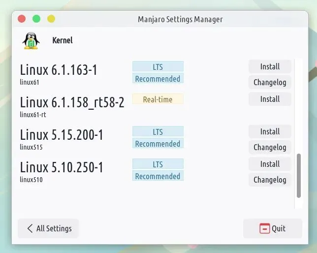 在“设置”应用中,你会找到一个标有“驱动程序、内核、语言、时间、日期、用户、账户、键盘布局”的选项。这就是 Manjaro 设置管理器,其中一个最重要的工具是内核管理器(图 3),你可以在其中从当前内核切换到列表中包含 Linux 6.19.2-1 到 5.10.250-1 的任何内核。