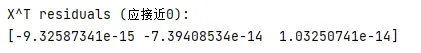 # file: projection_property.pyimport numpy as npdefmain(): np.random.seed(0) X = np.random.randn(100, 2) X = np.hstack([np.ones((100,1)), X]) beta = np.array([1,2,3]) y = X @ beta + np.random.randn(100) beta_hat = np.linalg.inv(X.T @ X) @ X.T @ y residuals = y - X @ beta_hat check = X.T @ residuals print("X^T residuals (应接近0):") print(check)if __name__ == "__main__": main()