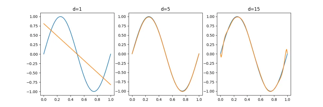 # file: bias_variance_simulation.pyimport numpy as npimport matplotlib.pyplot as pltdeftrue_function(x):return np.sin(2*np.pi*x)deffit_model(x, y, degree):return np.polyfit(x, y, degree)defpredict(coeffs, x):return np.polyval(coeffs, x)defmain(): np.random.seed(0) x_test = np.linspace(0,1,100) y_true = true_function(x_test) degrees = [1, 5, 15] plt.figure(figsize=(12,4))for i, d in enumerate(degrees): preds = []for _ in range(100): x_train = np.linspace(0,1,20) y_train = true_function(x_train) + np.random.normal(0,0.2,20) coeffs = fit_model(x_train, y_train, d) y_pred = predict(coeffs, x_test) preds.append(y_pred) preds = np.array(preds) mean_pred = np.mean(preds, axis=0) bias = np.mean((mean_pred - y_true)**2) variance = np.mean(np.var(preds, axis=0)) print(f"degree={d}, bias={bias:.4f}, var={variance:.4f}") plt.subplot(1,3,i+1) plt.plot(x_test, y_true, label="true") plt.plot(x_test, mean_pred, label="mean pred") plt.title(f"d={d}") plt.show()if __name__ == "__main__": main()