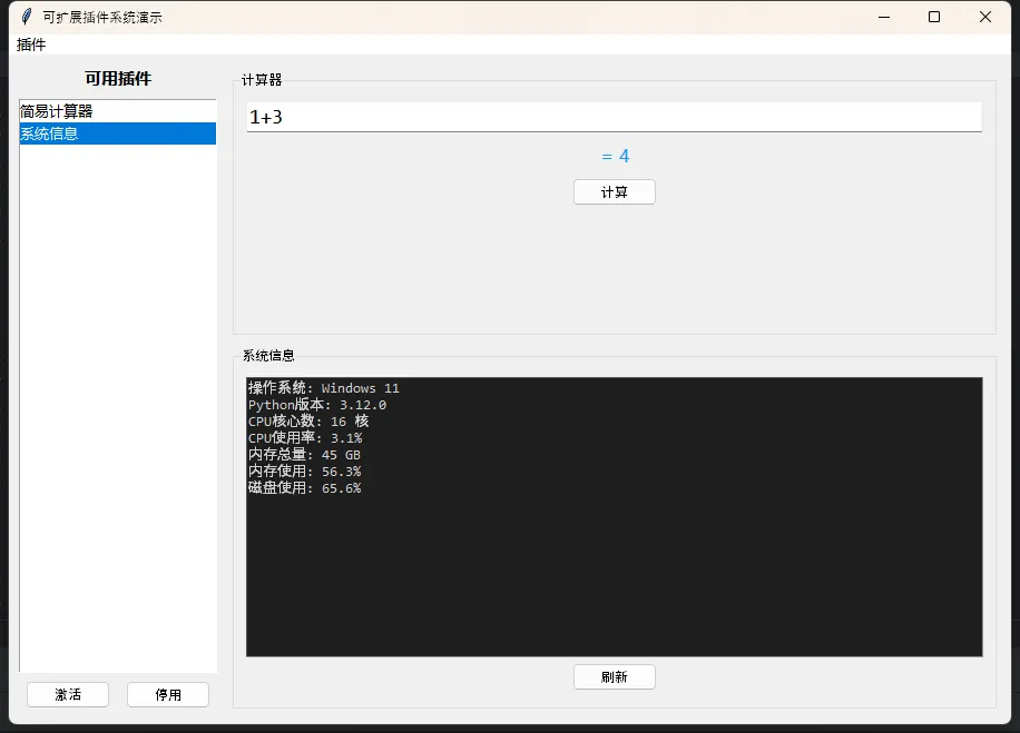 import tkinter as tkfrom tkinter import ttkimport platform, psutilimport sys, ossys.path.insert(0, os.path.dirname(os.path.dirname(__file__)))from plugin_base import PluginBaseclassSysInfoPlugin(PluginBase): name = "系统信息" version = "1.1.0" description = "显示当前系统运行状态" author = "示例作者"defactivate(self, parent_frame: tk.Frame) -> None:self.frame = ttk.LabelFrame(parent_frame, text="系统信息", padding=10)self.frame.pack(fill=tk.BOTH, expand=True, padx=5, pady=5)self.info_text = tk.Text(self.frame, height=10, font=("Consolas", 10), state=tk.DISABLED, bg="#1e1e1e", fg="#d4d4d4")self.info_text.pack(fill=tk.BOTH, expand=True) ttk.Button(self.frame, text="刷新", command=self._refresh).pack(pady=5)self._refresh()def_refresh(self): info_lines = [f"操作系统: {platform.system()}{platform.release()}",f"Python版本: {platform.python_version()}",f"CPU核心数: {psutil.cpu_count()} 核",f"CPU使用率: {psutil.cpu_percent(interval=0.5)}%",f"内存总量: {psutil.virtual_memory().total // (1024**3)} GB",f"内存使用: {psutil.virtual_memory().percent}%",f"磁盘使用: {psutil.disk_usage('/').percent}%", ]self.info_text.config(state=tk.NORMAL)self.info_text.delete("1.0", tk.END)self.info_text.insert(tk.END, "\n".join(info_lines))self.info_text.config(state=tk.DISABLED)defdeactivate(self) -> None:ifhasattr(self, "frame"):self.frame.destroy()把插件管理器接进主程序,这部分代码量其实很少: