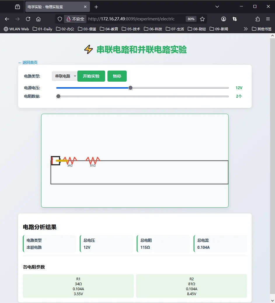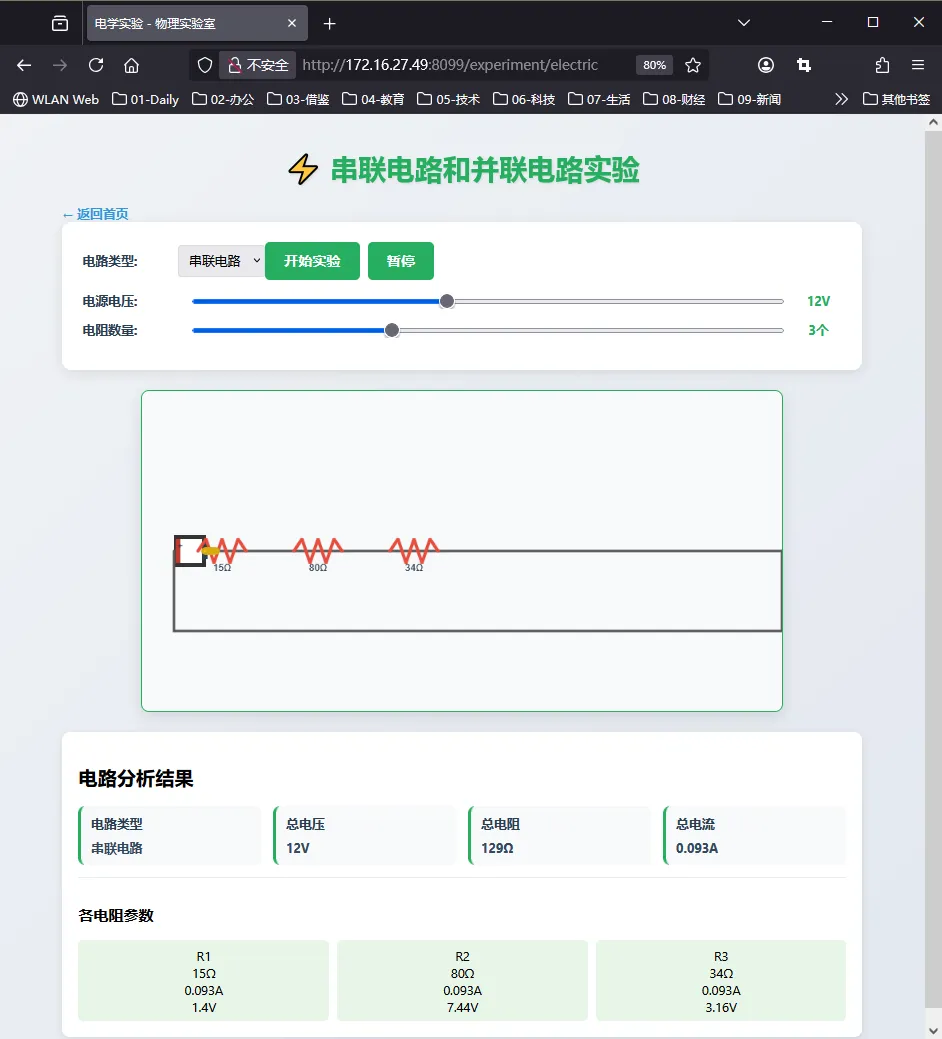 调整“电路类型”、“电源电压”和“电阻数量”后,开始实验