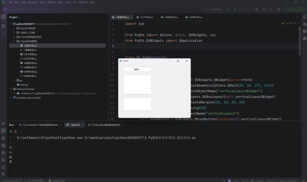 insertLayout ():在指定索引位置插入子布局,参数为(索引, 布局, stretch=0),精准嵌套子布局到垂直布局的指定位置。