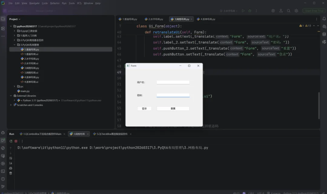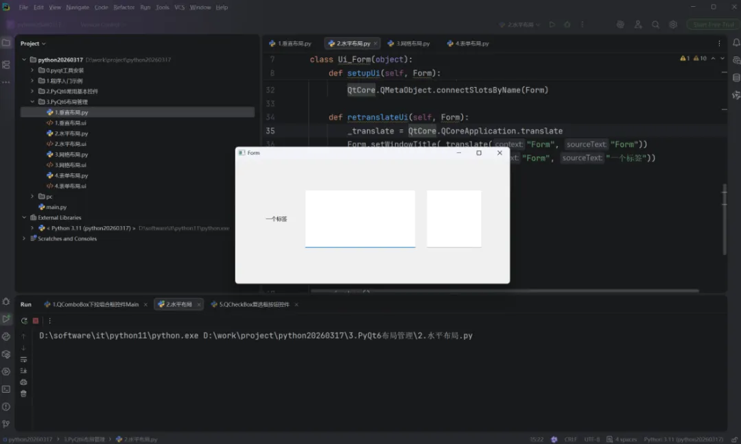 文本标签 + 字段:addRow("用户名:", QLineEdit())(自动创建 QLabel 作为标签);