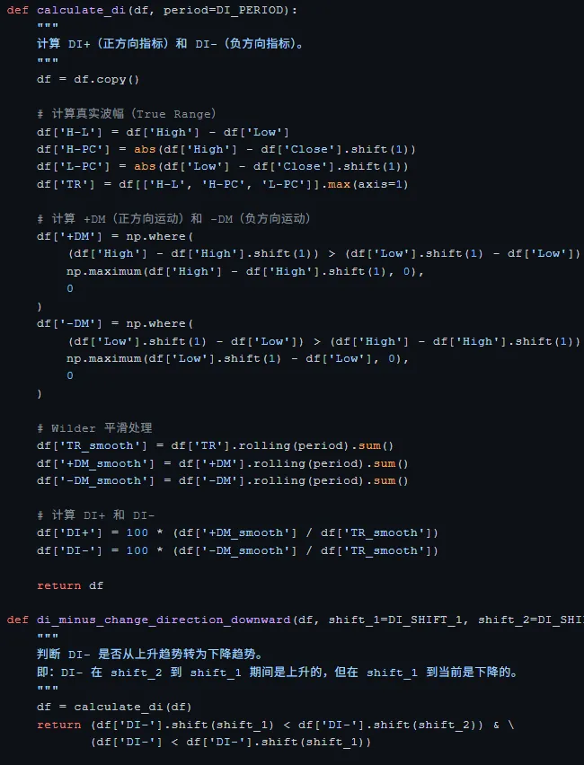 第二,DI减速过滤机制。 这是策略的核心过滤器。系统引入动向指标中的+DI与-DI。在多头场景下,策略不仅要求+DI位于-DI上方(ADX确认趋势存在),更重要的是检测+DI的斜率变化。即当价格向上突破EMA时,+DI的数值必须处于从高位“减速”或“走平”的状态,而非仍在加速上扬。逻辑在于:如果+DI仍在急速拉升,往往意味着价格处于短期超买或情绪高潮,突破后容易立即回调;而+DI减速则表明主导力量进入稳健释放阶段,突破的可持续性更强。