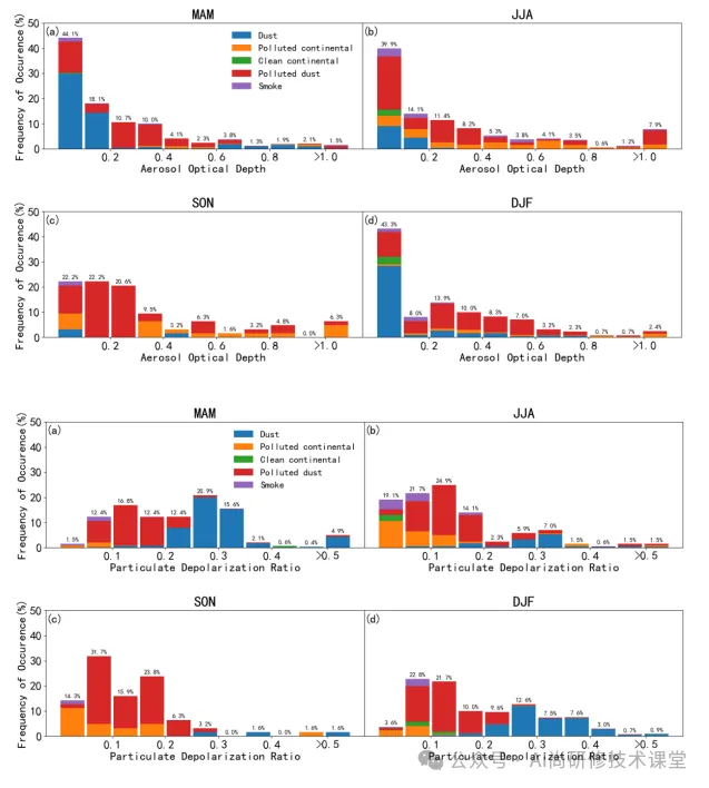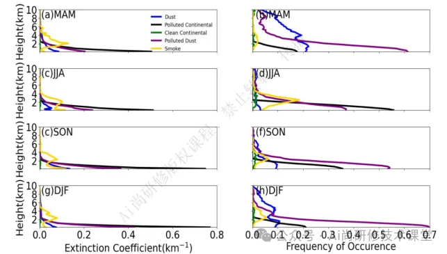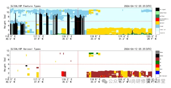 专题四 CALIPSO气溶胶数据处理及反演分析(实战进阶篇) | 1. CALIPSO气溶胶数据下载(包括333m混合层、1km云层、5km云层、5km气溶胶层、5km混合层、5km云廓线等) ![]() 2.激光雷达原理介绍(后向回波信号原理,公式讲解。后向散射系数、消光系数、退偏比、彩色比等相关参数介绍,CALIOP并通过这些参数将气溶胶分类) ![]() ![]() 3.Jupyter Notebook实操CALIOP数据: 绘制CALIOP数据轨迹图,通过轨迹图确实研究区域 ![]() 绘制特征类型轨迹图 ![]() 绘制CALIOP特征图和不同气溶胶类型图 ![]() 绘制气溶胶类型饼状图(分析该地区气溶胶类型) ![]() 绘制CALIOP气溶胶数据年趋势变化和月份变化图(分析该地区污染变化) ![]() ![]() 绘制气溶胶消光系数和出现率季节变化图(分析该地区季节变化导致气溶胶变化) ![]() 绘制气溶胶AOD,颜色比,退偏比彩图 ![]() ![]() |