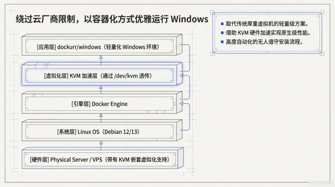 这种场景下装一台实体机,麻烦。再单独开一套虚拟机,重。很多人最后会绕到这个项目:dockur/windows 这个仓库,实际拉取的镜像名是 dockurr/windows。它不是“原生 Windows 容器”,而是在 Linux 上借助 KVM 跑一套自动安装的 Windows,项目自带 ISO 下载、KVM 加速、网页查看器,8006 用浏览器看安装过程,3389 用 RDP 远程连接。README 里给的 Compose 示例也是这一套。([GitHub][1])