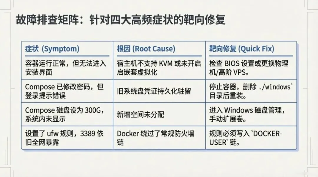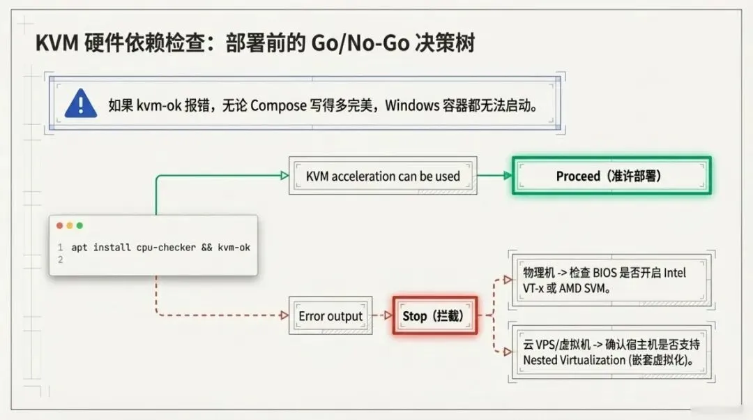 - • 先检查 KVM,避免容器起了半天其实宿主机根本不支持。
