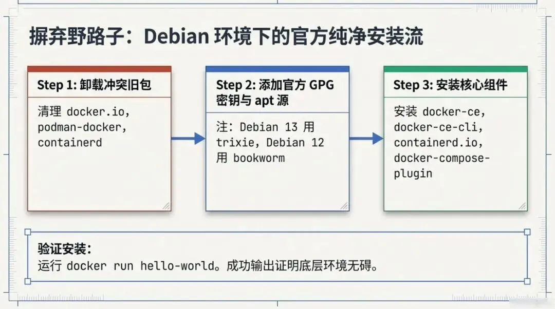 下面这部分,我用 Debian 13 / 12 来写。Docker 官方当前对 Debian 支持的版本是 Debian 13、12 和 11,推荐安装方式是走官方 apt 仓库;官方也明确写了,安装前要先移除可能冲突的旧包,比如 docker.io、docker-compose、podman-docker、containerd、runc 这些。([Docker Documentation][2])