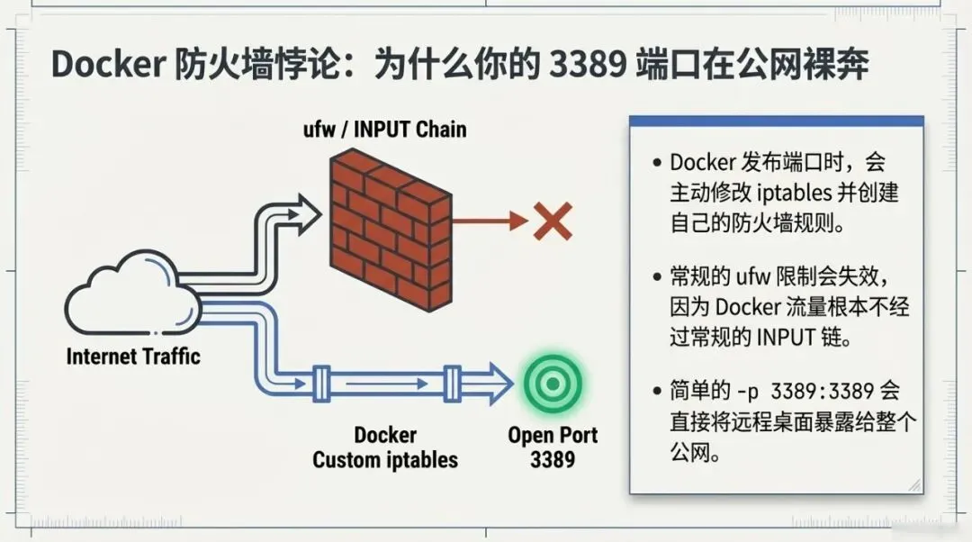 这也就是为什么很多机器明明“只是起了个容器”,结果 3389 已经亮到公网了。 不是 Docker 异常。 是 Docker 默认就会这么做。([Docker Documentation][3])