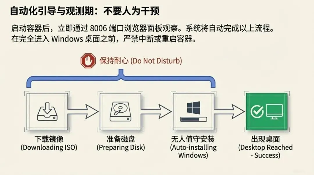 这一步不要着急。 第一次启动,它要自己下载镜像、准备磁盘、完成自动安装。真正该做的,是盯住 8006 的画面,看它有没有一路走到桌面。README 说得很清楚:桌面出现,才算安装完成。([GitHub][1])
