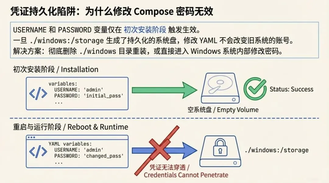 你第一次用的是旧用户名、旧密码。 后来改了 Compose。 但 ./windows:/storage 这个目录没删。 结果你第二次启动时,看到的还是上一次那块盘,Windows 当然还认旧账号。