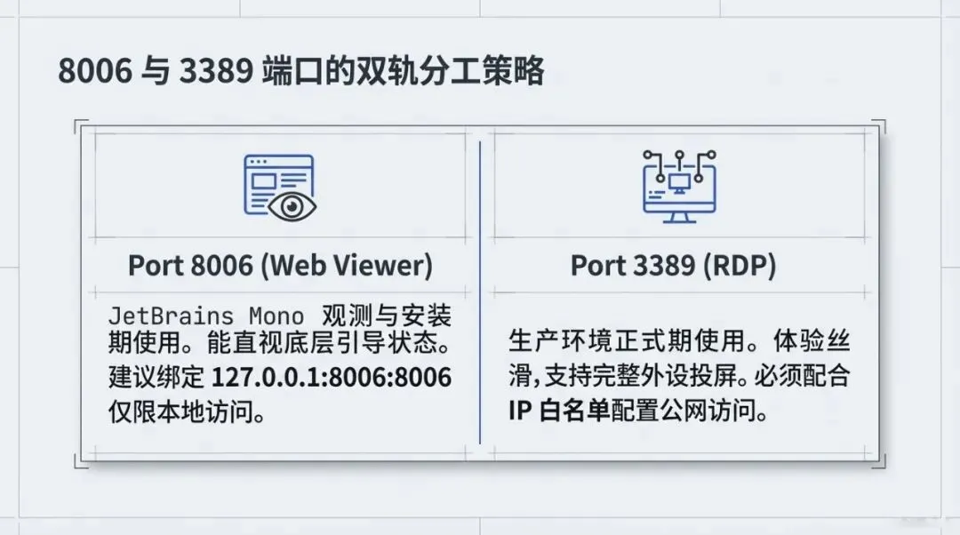 - • 8006 留给安装期和排障期。它像一块观察窗,系统到底卡在哪一步,一眼就看见。
