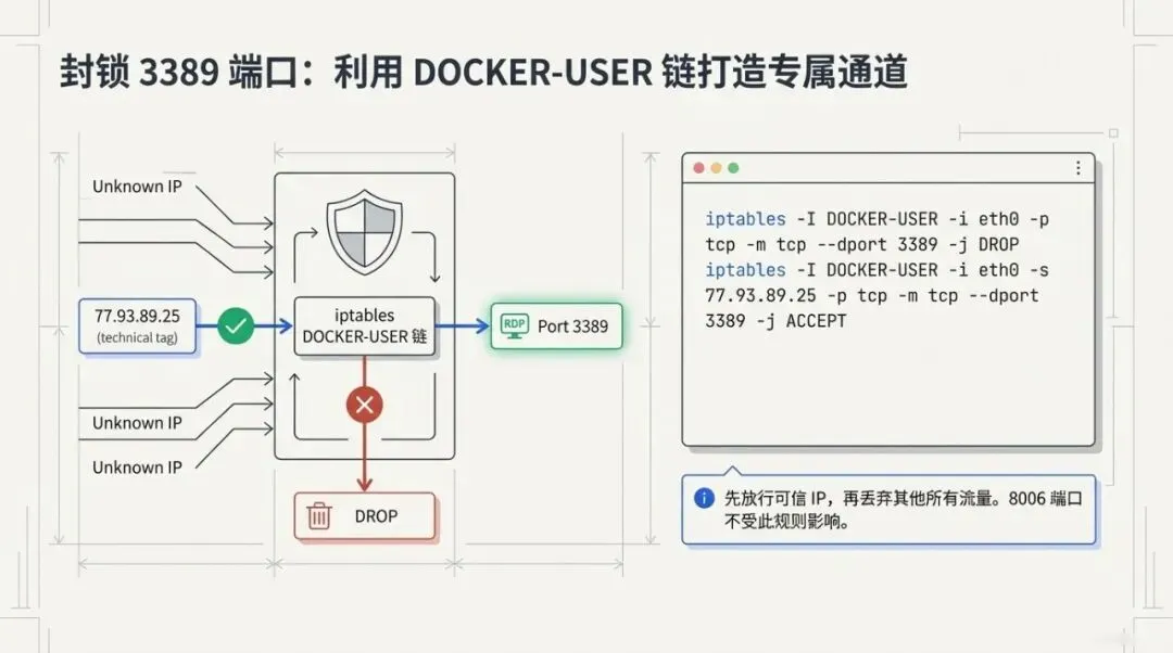 如果这台机子要放在公网,3389 别直接敞着。 Docker 官方关于 iptables 的文档写得很清楚:你想在 Docker 规则前面插入自己的过滤逻辑,要用 DOCKER-USER 链;写到普通 FORWARD 链后面,流量可能已经被 Docker 自己的规则放过去了。([Docker Documentation][4])