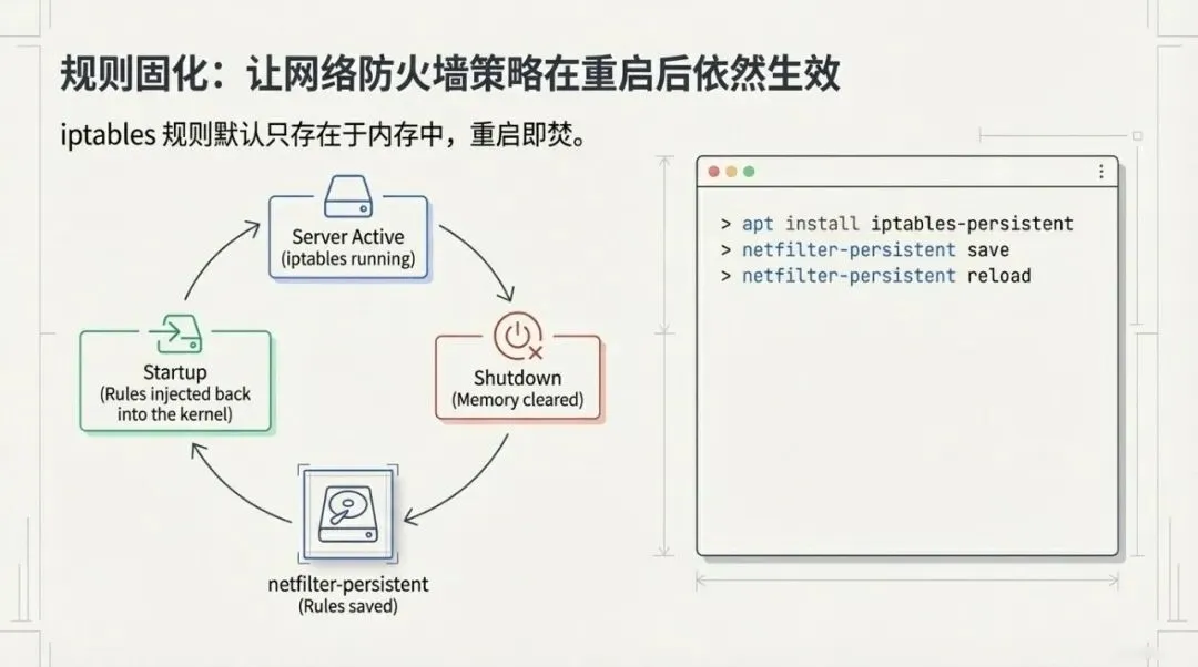 Debian 的 netfilter-persistent 手册写得很明确:它负责在开机和关机时加载、刷新、保存 netfilter 规则;可用命令包括 start、stop、flush、save。其中 save 的作用,就是把当前已加载的规则写到持久化存储里。([Debian Manpages][5])