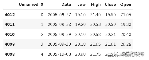 # 从URL中抓取数据# 将日期、低点、高点、成交量、收盘价、开盘价存储到Pandas DataFrame中#提取股票市场数据 df = pd.DataFrame(columns=\['Date','Low', 'High', 'Close', ' Open'\])print('数据保存到:%s'%file\_to\_save)# 如果数据已经存在,只需从CSV中加载即可 否则。print('文件已经存在,从CSV中加载数据') df = pd.read\_csv(file\_to_save)
