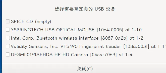 最后是USB,我还在按照以前在ProxmoxVE私有云上的经验,给每个虚拟机添加USB设备。实际上可以随时更改,虚拟机(M)->重定向USB设备(R),如下,勾选需要使用的USB设备即可