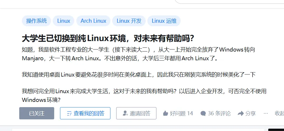 最近在知乎上刷到一个帖子,有大学生说自己完全切换到Linux环境,询问这对找工作是否有帮助,评论区看法各异。