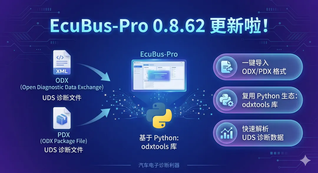 在刚刚推送的 0.8.62 版本中,我们正式解锁了一项极其硬核且实用的新功能:全面支持 UDS 的 ODX 和 PDX 格式文件导入!