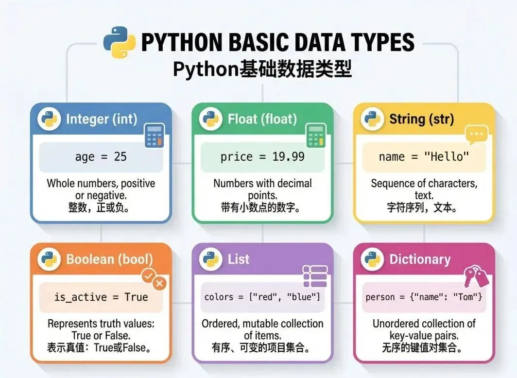# 定义各种类型的变量my_name = "你的名字"my_age = 你的年龄my_height = 你的身高is_learning = Truemy_hobbies = ["看剧", "打游戏", "睡觉"]# 打印类型print(type(my_name))print(type(my_age))print(type(my_height))print(type(is_learning))print(type(my_hobbies))# 尝试类型转换print(int(3.7)) # 会输出什么?print(bool("")) # 会输出什么?