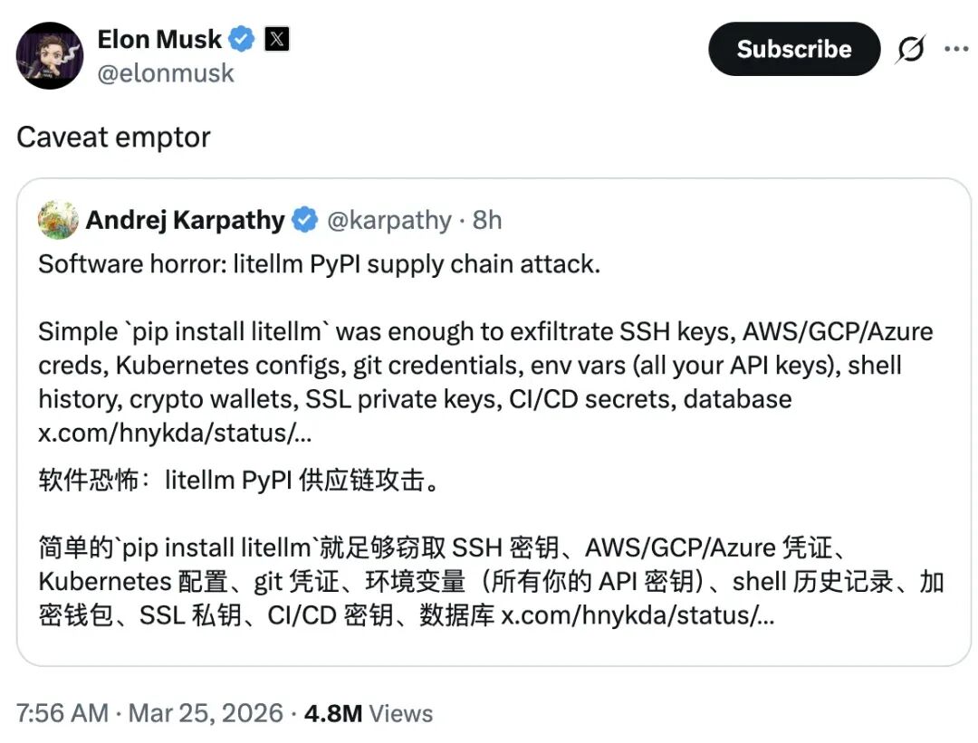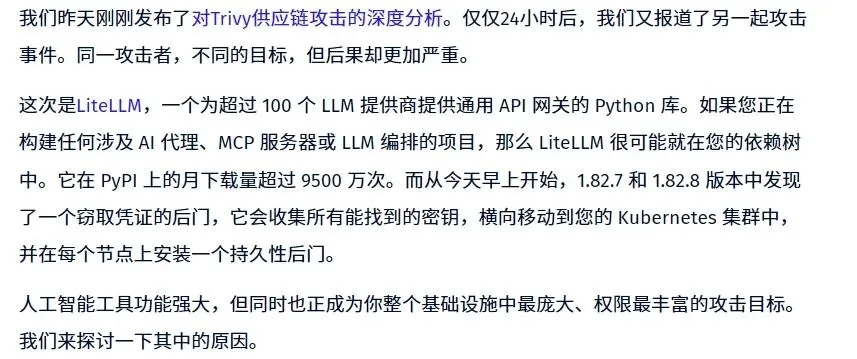 就在这两天,Python 生态系统遭遇了一场波及极广的供应链攻击。这次事件的中心是极受欢迎的开源 LLM 代理库LiteLLM,它在被投毒期间正处于每日数百万次下载的高峰期。