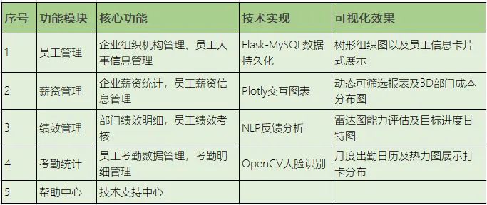 系统涵盖企业人力资源管理的核心模块:员工档案管理、薪资计算、绩效评定和考勤统计等,实现“增删改查”全流程自动化。结合 Matplotlib 与 Plotly 生成直观的数据图表,并基于 Plotly Dash 搭建动态交互式数据仪表盘,实时展示员工分布、考勤趋势、人力成本与绩效分析等关键指标,助力管理决策。