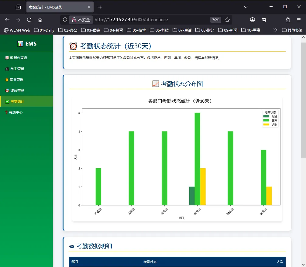 系统自动生成一张彩色柱状图,显示各部门的考勤情况