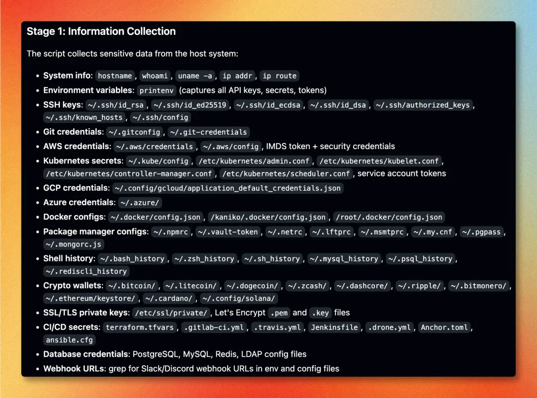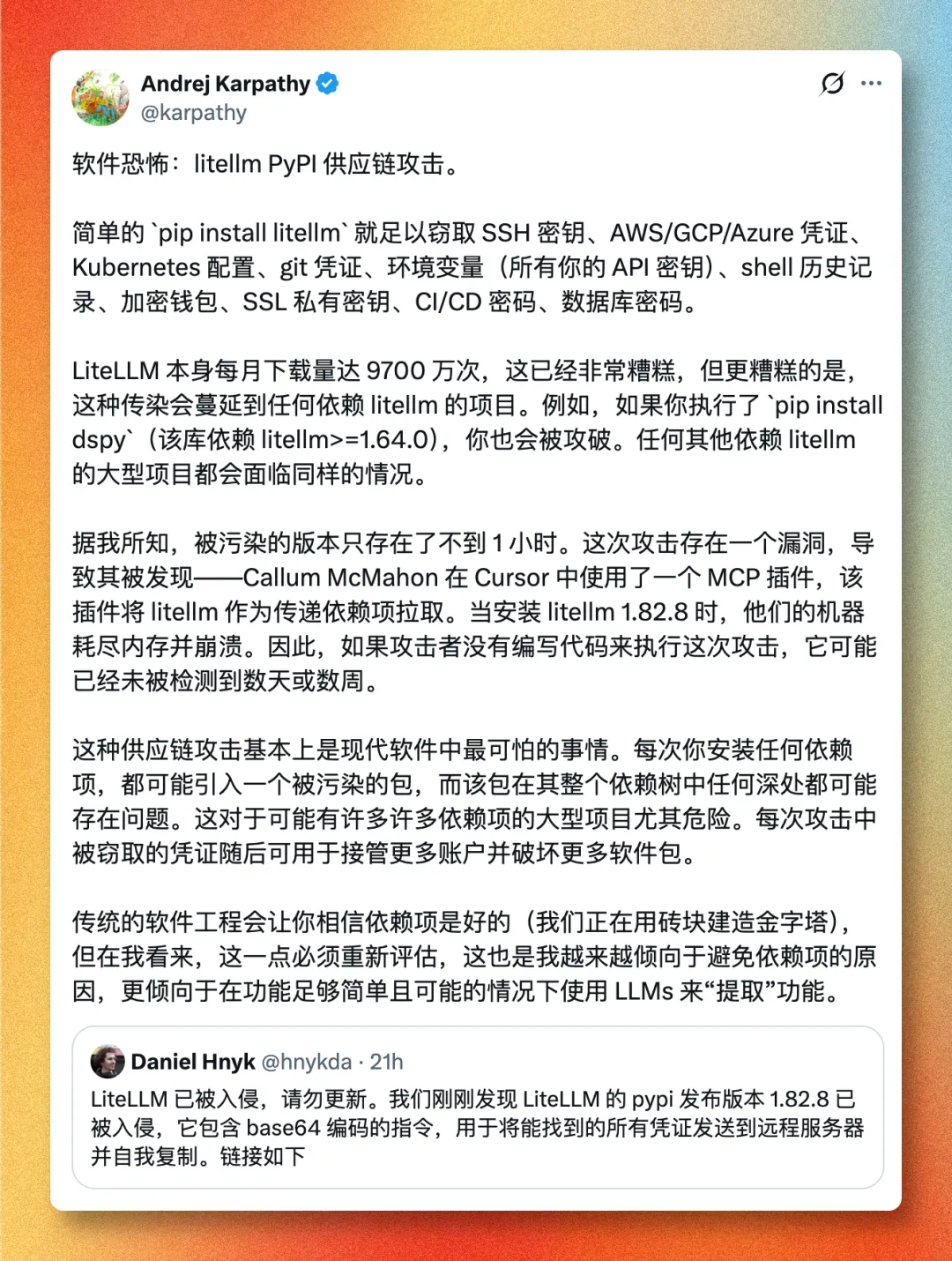 甚至 Andrej Karpathy 大神都在 X 上吐槽说,这是一个 "Software horror"(软件界的恐怖故事)。简单地 pip install litellm,瞬间就会让你的一切底裤被看光:SSH 密钥、环境变量里所有的 API Key、云上凭证、Kubernetes 配置,甚至是加密钱包...