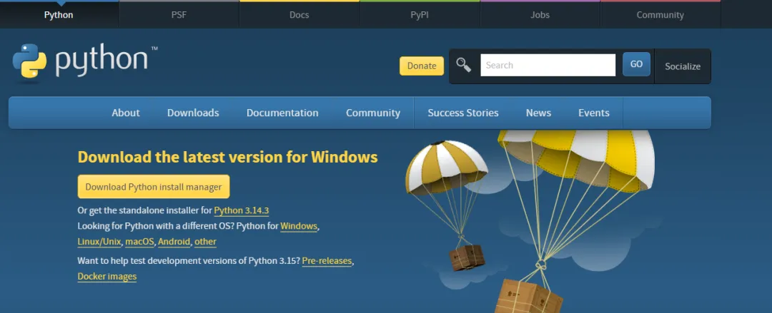 - • 下载安装包打开浏览器,访问 python.org[1]那个黄色的大按钮 "Download Python",点它!