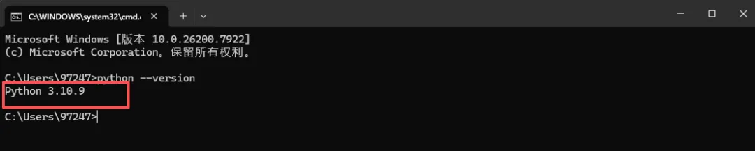 Win + R,输入 cmd,回车。在黑乎乎的窗口里输入:如果显示类似 Python 3.10.9,恭喜,成了!