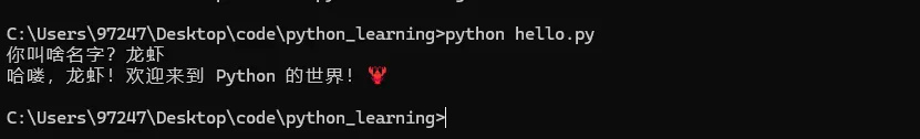 # 这是我的第一行 Python 代码!name = input("你叫啥名字?")print(f"哈喽,{name}!欢迎来到 Python 的世界!🦞")